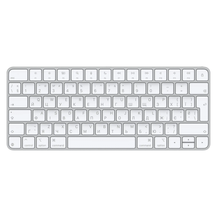 Клавіатура Magic Keyboard забезпечує надзвичайно комфортний та точний набір тексту на Mac та Apple Vision Pro. Вона також бездротова та перезаряджається завдяки неймовірно довговічному внутрішньому акумулятору, який забезпечує роботу клавіатури протягом місяця або більше між підзарядками. Вона автоматично з'єднується з Mac, так що ви можете відразу ж приступити до роботи.