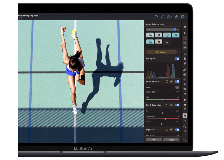 16-ядерна система Neural Engine. Машинне навчання до 9 разів швидше. Вау. Додатки на MacBook Air можуть використовувати технології машинного навчання - наприклад, для автоматичної корекції фотознімків на професійному рівні або для більш точного застосування смарт-інструментів і аудіофільтри. Це справжній комп'ютерний розум у вас на службі.