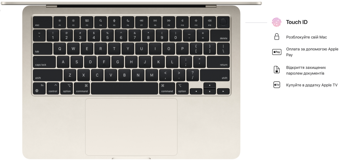 Сліпучий 13,6-дюймовий дисплей Liquid Retina – найбільший та яскравий MacBook Air за всю історію. З мільярдом кольорів. Тому текст чіткіший, а фото та відео чіткіший, контрастніший і детальніший.