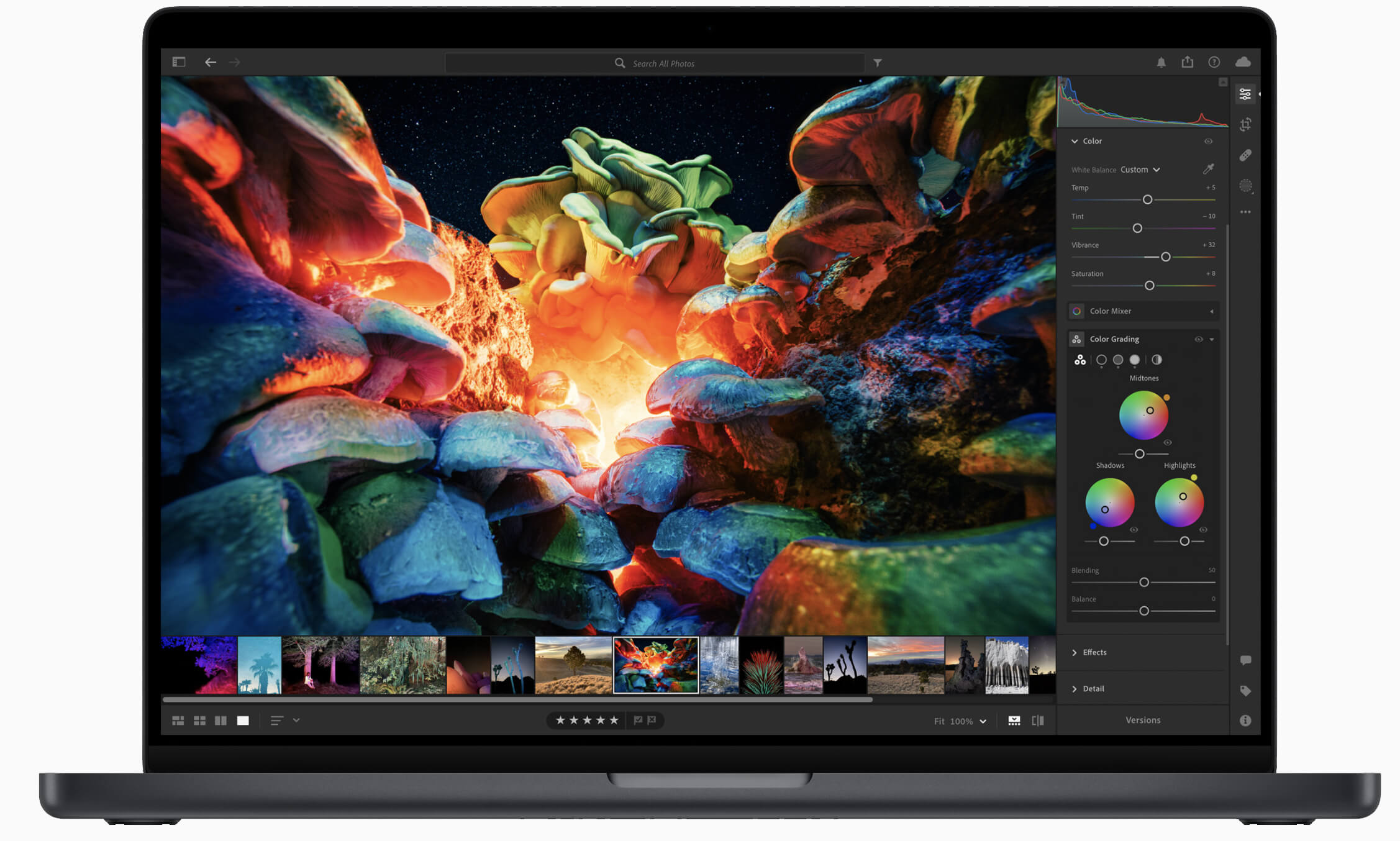 Завдяки M2 Pro і M2 Max — найпотужнішим і найефективнішим у світі чіпам для професійних ноутбуків — MacBook Pro може виконувати такі складні завдання, як відтворення ефектів у 6 разів швидше, ніж найшвидший MacBook Pro на базі Intel, і 2-кратний градієнт кольору.