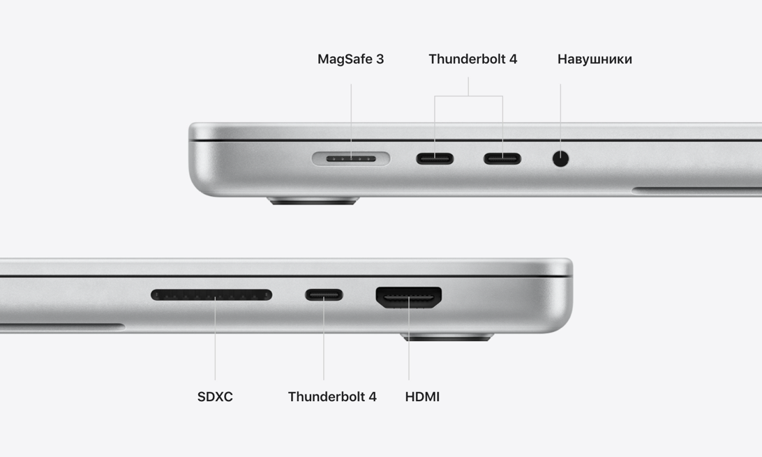 Слот для карт SDXC дозволяє переносити фото і відео. Порт HDMI - підключати телевізори та монітори. Вихід 3,5 мм автоматично розпізнає навушники з високим опором і коригує параметри. Три порти Thunderbolt 4 служать для підключення високошвидкісних периферійних пристроїв. А до гнізда живлення MagSafe 3 легко прімагнітиться кабель для швидкої зарядки.