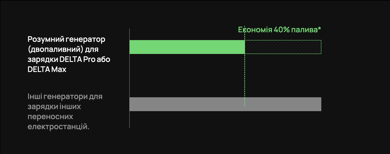 Заряжая DELTA Pro, DELTA Max или Power Kits, вы можете сэкономить до 40% на топливе по сравнению с другими генераторами и портативными электростанциями. Вот как это работает: