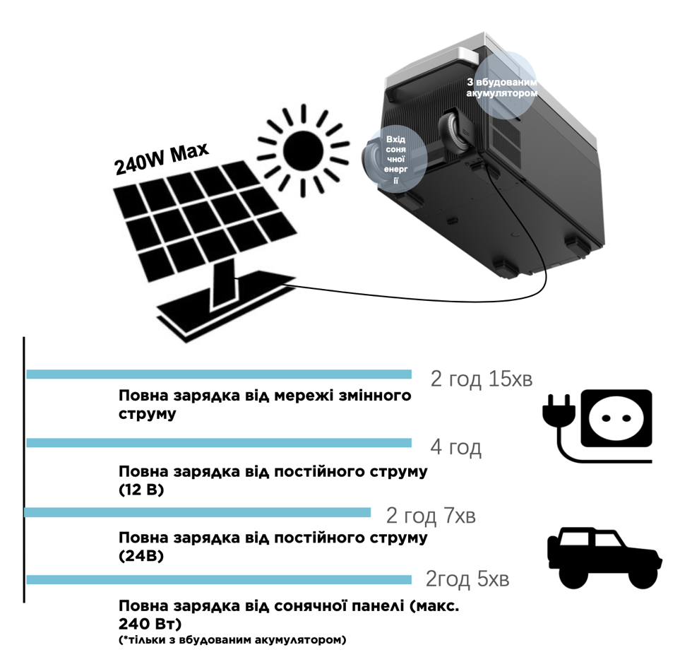 Також швидко заряджайте холодильник від мережі 220 В за 2 год.