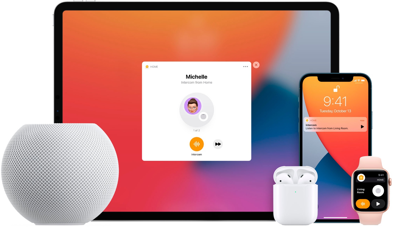 Нова функція «Інтерком» дозволяє всім членам сім'ї легко і швидко спілкуватися один з одним, коли вони вдома. Людина може передати повідомлення по Інтерком в іншу кімнату або зону або відразу в кілька кімнат - і його голос буде автоматично відтворений на відповідній колонці HomePod. Інтерком підтримується на iPhone, iPad, Apple Watch, AirPods і CarPlay, тому отримувати повідомлення зможуть всі, хто знаходиться в будинку, а відправляти їх можна, навіть коли ви гуляєте у дворі або перебуваєте далеко від будинку.