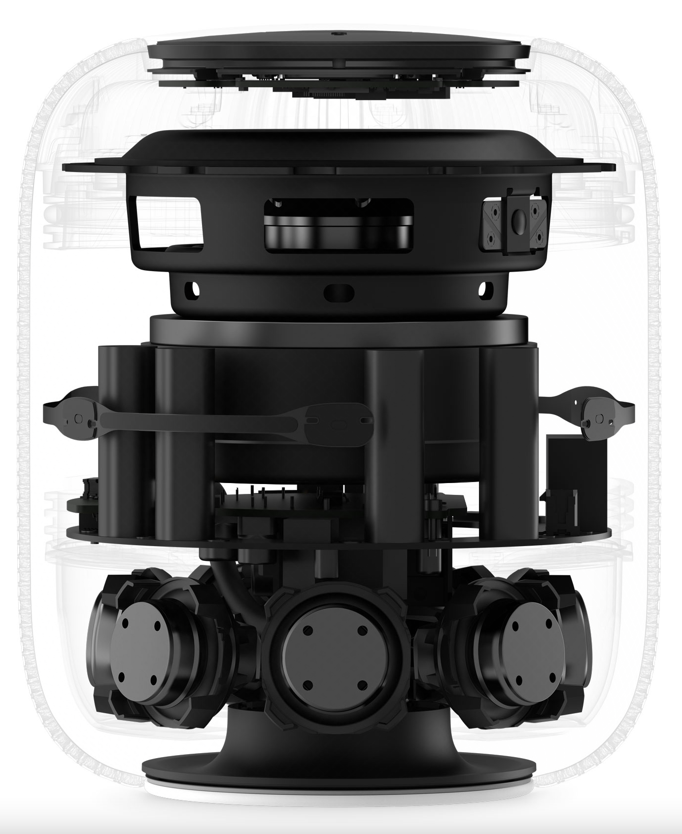 Якість, насиченість і чистота звучання багато в чому визначається завдяки технічним характеристикам акустики. Вбудований високоамплітудний вуфер зі спеціалізованим підсилювачем відтворюють широкий діапазон глибоких, багатих басів. Сім динаміків для верхніх частот створюють ефект звуку, який в буквальному сенсі доноситься з кожного кутка кімнати на 360º. Акустика використовує технології спрямованого сигналу для повноцінного використання мікрофона під час відтворення музики, поліпшену систему ехоподавлення і буферизації. HomePod також використовує вдосконалений алгоритм, який безперервно аналізує музику і динамічно налаштовує низькі частоти. В результаті виходить плавний звук без будь-яких спотворень.