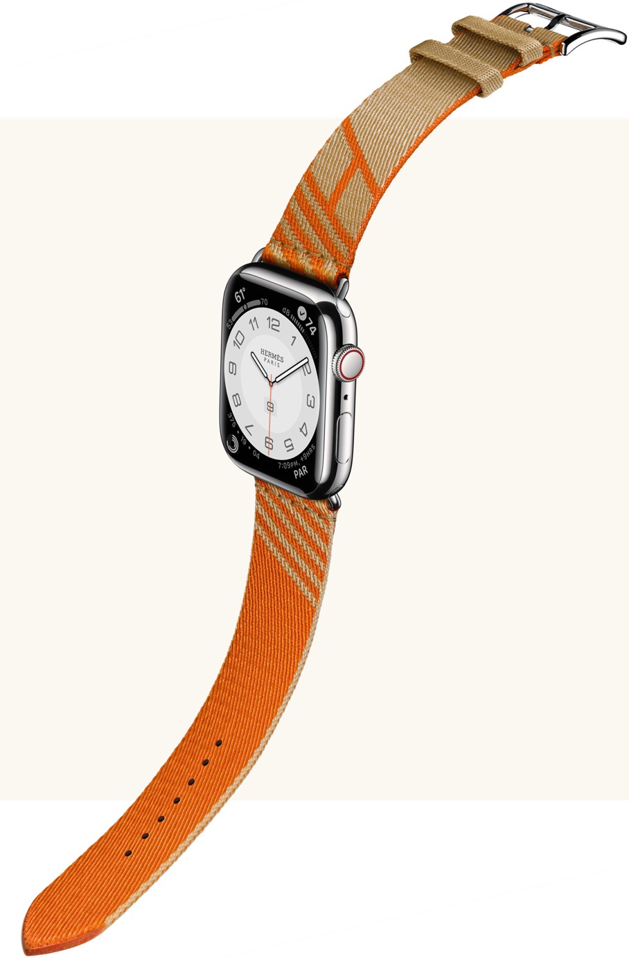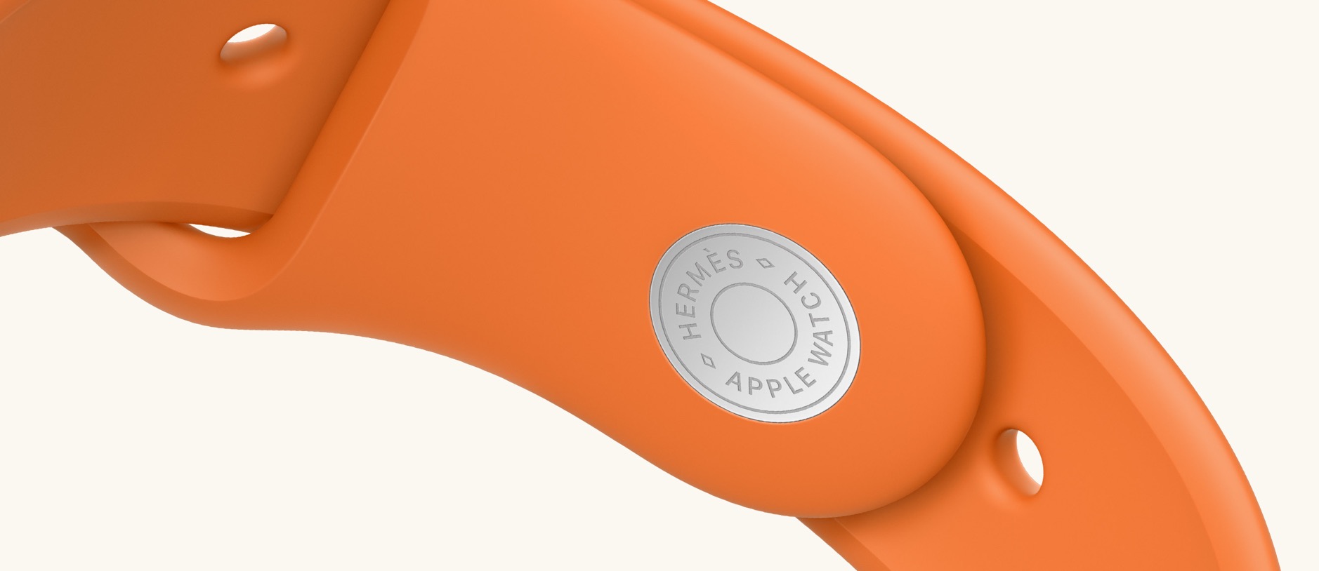 Легкий, гнучкий, водонепроникний ремінець Sport Band фірмового жовтогарячого кольору Hermès ідеально підходить для тренувань. Входить у комплект як додатковий ремінець з кожним сріблястим корпусом Apple Watch Hermès з нержавіючої сталі. А до корпусів із нержавіючої сталі кольору «космос» додається відповідний спортивний ремінець Hermès Sport Band чорного кольору.