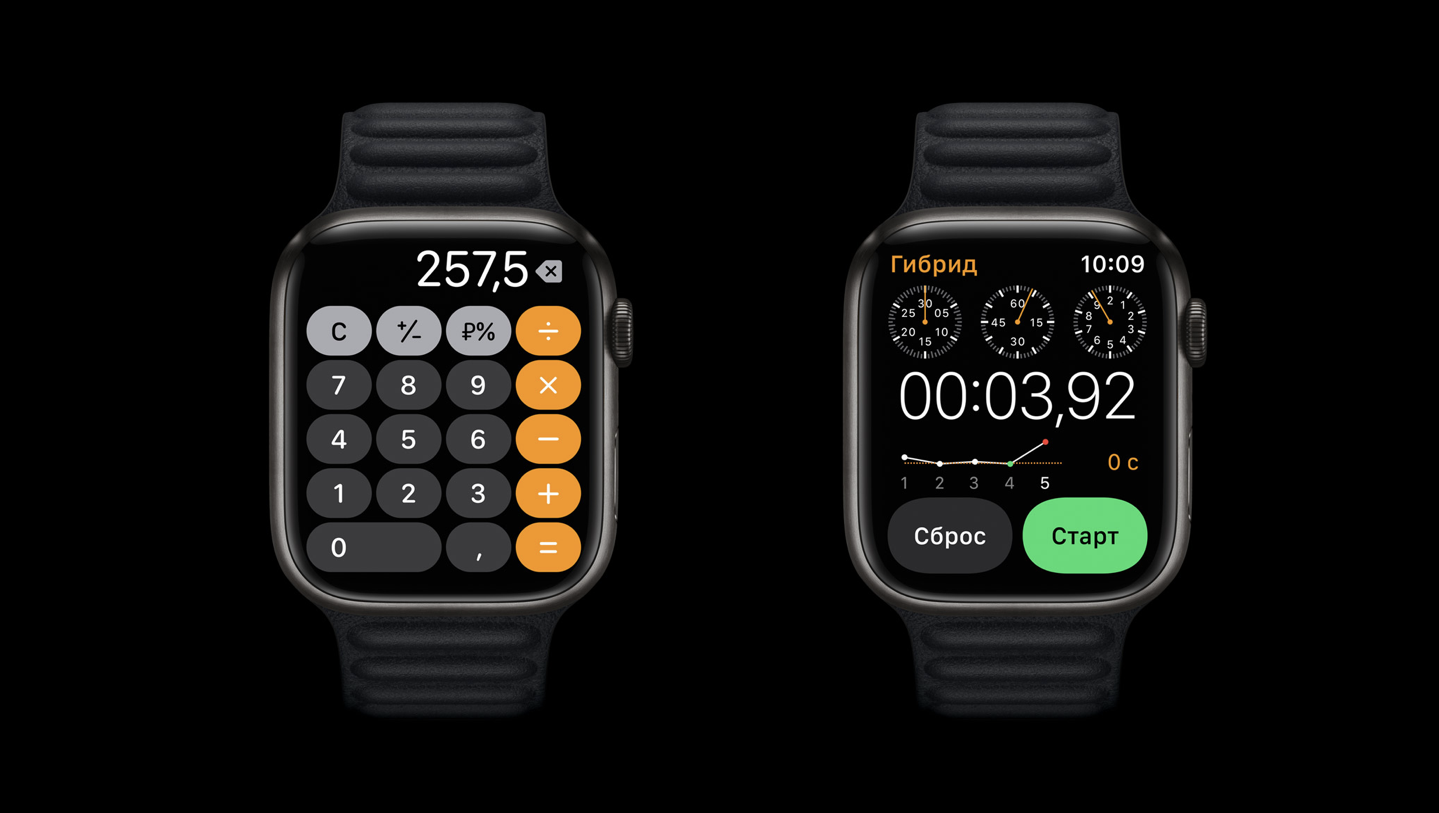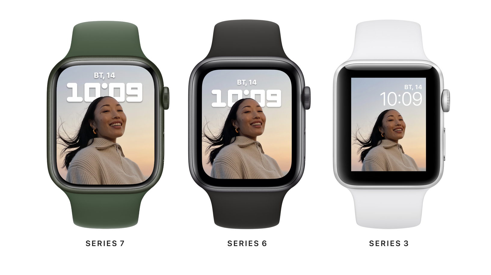 У watchOS 8 з'явилися нові циферблати, створені спеціально для збільшеного дисплея Apple Watch Series 7. На новому циферблаті «Контур» цифри розміщені по самому краю дисплея, а анімація змінюється в залежності від часу доби, підкреслюючи поточну годину. На новому циферблаті «Модулі» додатковий простір дисплея використовується для того, щоб розмістити в центрі два великих і інформативних розширення. Уже знайомий подвійний циферблат для мандрівників «Навколо світу» нагадує дизайн класичного годинника і показує час в 24 часових поясах. Він доступний на моделях Apple Watch Series 4 і новіше. Циферблат «Портрети» допомагає додати годинах індивідуальності, використовуючи можливості режиму «Портрет», що дозволяє надати глибину фотографій на iPhone.
