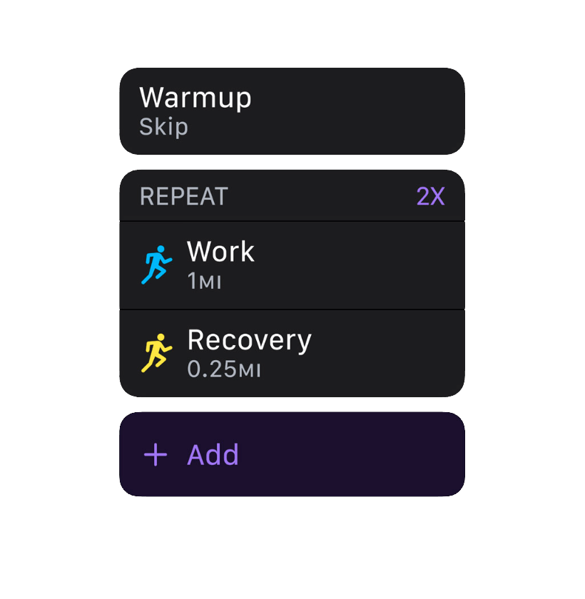 Налаштуйте інтервали тренувань і відновлення відповідно до свого стилю тренувань. Отримуйте підказки щодо темпу, пульсу, каденції та потужності. Таким чином ви визначаєте, як ви хочете досягти своїх цілей.