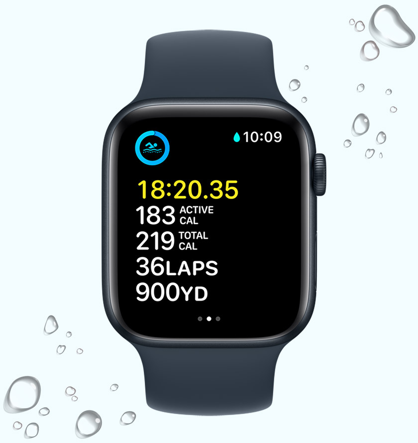 Apple Watch SE водонепроникний на глибині 50 метрів. Відстежуйте свої шпагати та сети в пулі. Намалюйте свій маршрут у відкритій воді. Переглядайте точні показники, навіть використовуючи кікборд. Незалежно від того, плескаєтеся ви, плаваєте чи займаєтесь серфінгом.